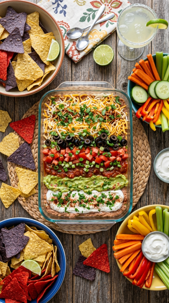 A layered taco dip is a party staple for a reason. It’s visually appealing and offers a medley of textures and flavors in every scoop. Start with a base of seasoned refried beans (or a spiced cream cheese layer for a lighter touch), then layer on guacamole, sour cream, salsa, shredded cheese, and a sprinkle of fresh cilantro. It’s a hearty option that everyone loves, perfect with corn chips or crunchy vegetable sticks.