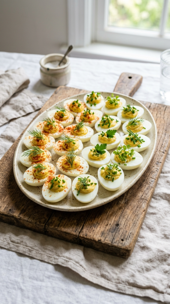 Deviled eggs are a classic for a reason. To elevate them, consider adding a twist. For a spicy version, mix the yolk filling with a touch of hot sauce and a crumble of blue cheese. For a vibrant, herby option, blend the yolks with fresh green herbs like cilantro, mint, and a bit of green chili for a refreshing, colorful bite. These are always a hit and can be made hours ahead of time.