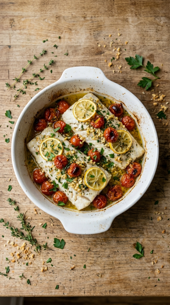 • Lemon Garlic Baked Cod: Picture tender cod fillets seasoned with garlic, a touch of oregano, and plenty of lemon. Add some cherry tomatoes to the pan, and as they burst, they create a lovely natural sauce. It’s a light, bright dish that feels elegant but takes minutes to prepare.