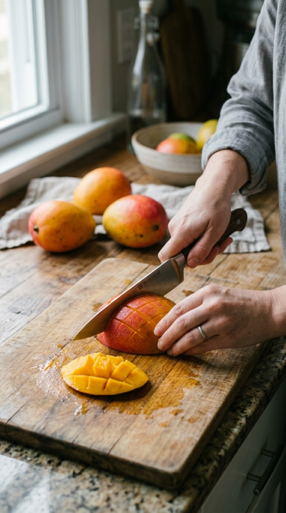 To cut a mango, stand it upright on a cutting board. Slice down each side of the flat pit, creating two large ‘cheeks’. Score the flesh of each cheek in a crosshatch pattern, being careful not to cut through the skin. Then, gently push the skin side up, and the mango cubes will pop out, ready to be scooped off. For the remaining flesh around the pit, you can carefully pare it away with a small knife and dice it.