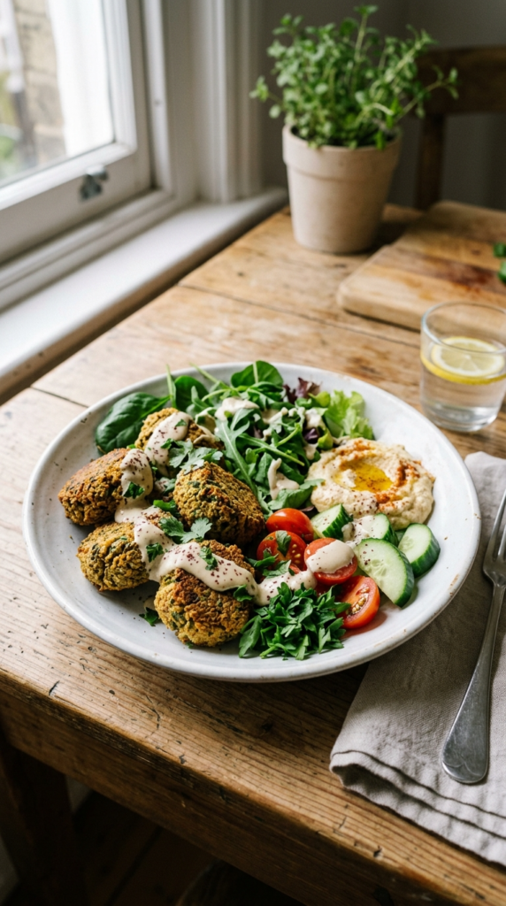 Crispy baked falafel pieces are the star of this bowl, served over a bed of mixed greens with crunchy cucumbers and shredded carrots. A tangy tahini dressing completes the experience, offering a delightful texture contrast and a burst of fresh flavor that’s both healthy and hearty. If you want a related recipe, have a look at Easy Slow Cooker Ground Beef Ideas for Indian Home Cooks.