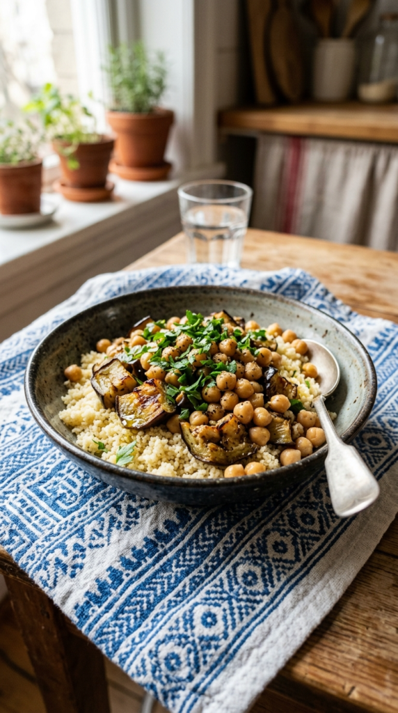 Roasted eggplant, seasoned with smoked paprika and coriander, pairs beautifully with warm chickpeas. Serve these over fluffy couscous or bulgur for a deeply satisfying and comforting meal. It’s a vegetarian dish that feels rich and flavorful without being heavy.