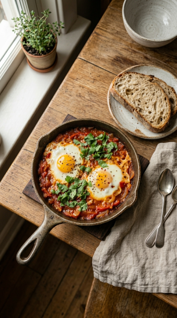 This classic dish is simpler than it looks. Sauté some chopped onions and garlic in olive oil, then add a can of crushed tomatoes (or fresh pureed tomatoes) and a pinch of cumin and paprika. Let it simmer until slightly thickened. Make a few wells in the sauce and crack eggs directly into them. Cover and cook until the whites are set and the yolks are still a little runny. Serve with a side of whole wheat bread to scoop up the delicious sauce. It’s wonderfully comforting and full of flavor.