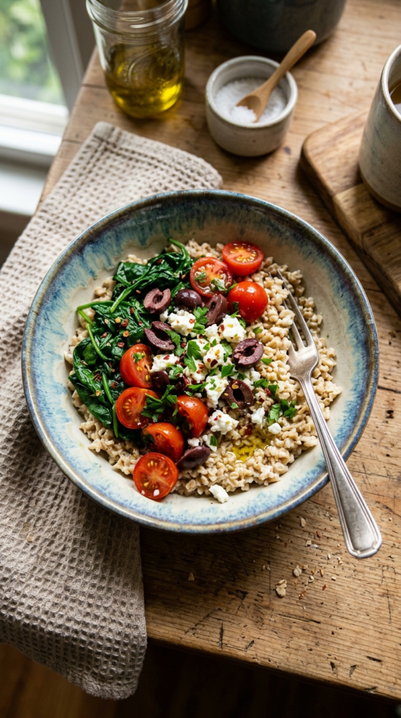 Move beyond sweet oats with this savory version. Cook rolled oats with water or vegetable broth. Once cooked, stir in some sautéed spinach, a handful of cherry tomatoes, and a few kalamata olives (or regular black olives). Finish with a drizzle of olive oil and a sprinkle of fresh oregano or basil. It’s a comforting, fiber-rich bowl that’s a refreshing change from sweet porridge.