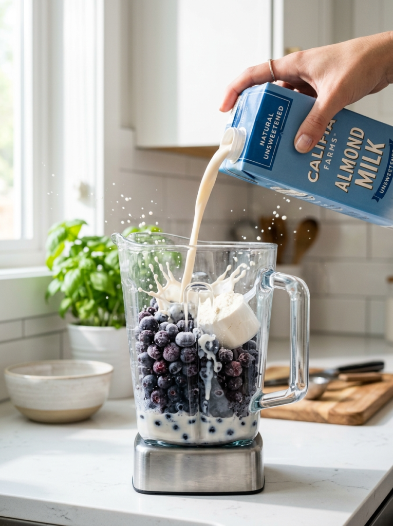 - Pour the almond milk into your blender first. Adding liquid first prevents the protein powder from sticking to the bottom of the container.