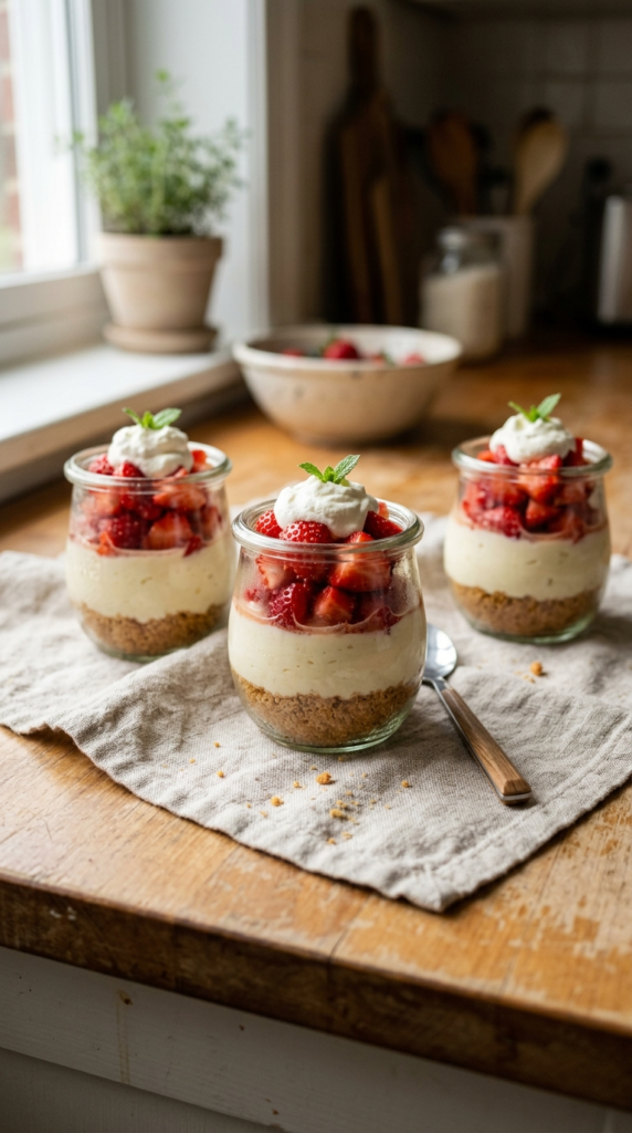 These individual jarred cheesecakes are not only adorable but incredibly practical. Layers of crumb crust, creamy no-bake cheesecake filling, and fresh strawberry puree or chopped berries make for a refreshing and portable dessert. They’re perfect for picnics, potlucks, or simply keeping a few handy in the fridge for a quick treat.