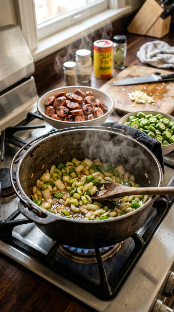 2. Add chopped onion, celery, and green bell pepper to the pot. Sauté until softened, about 5-7 minutes, scraping up any browned bits from the bottom of the pot.