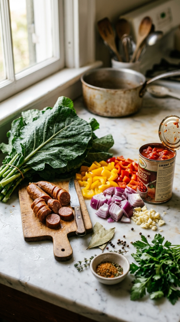 The best part about cooking from experience is knowing what simple ingredients make a big impact. Here’s what I gather for my Swamp Soup, though feel free to adjust based on your pantry.